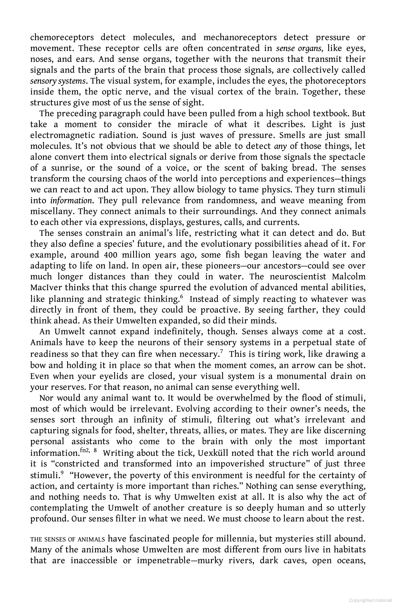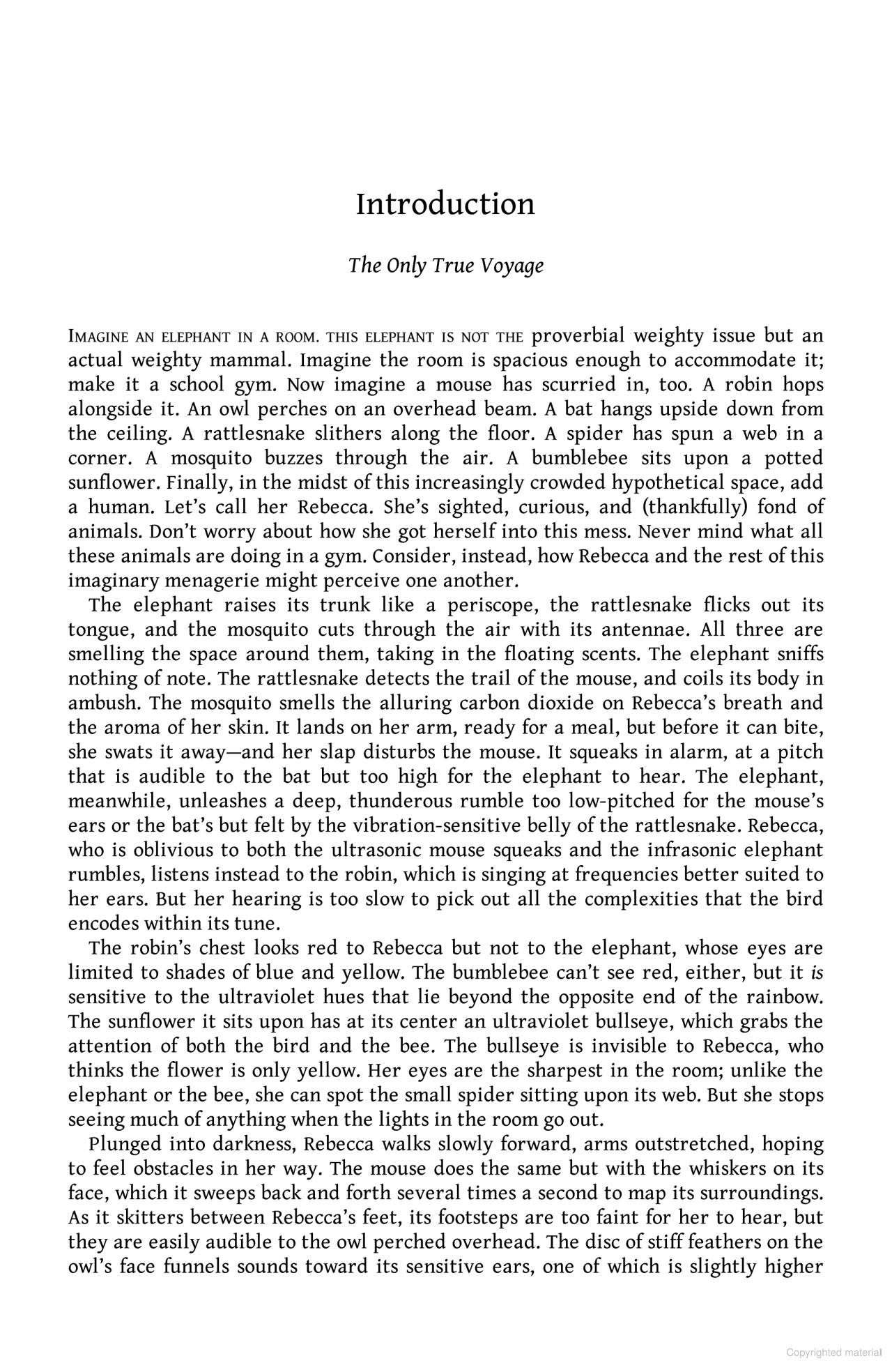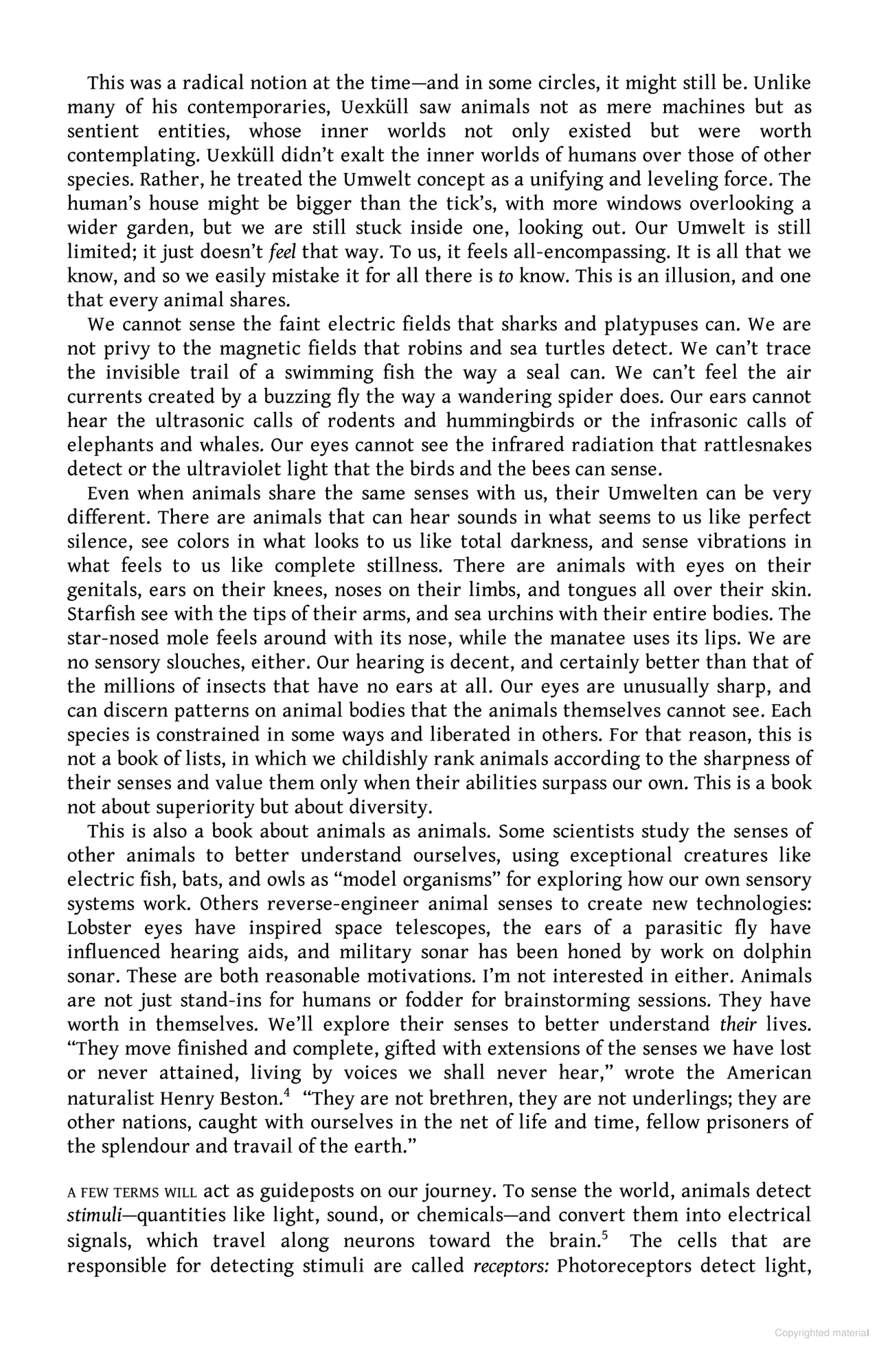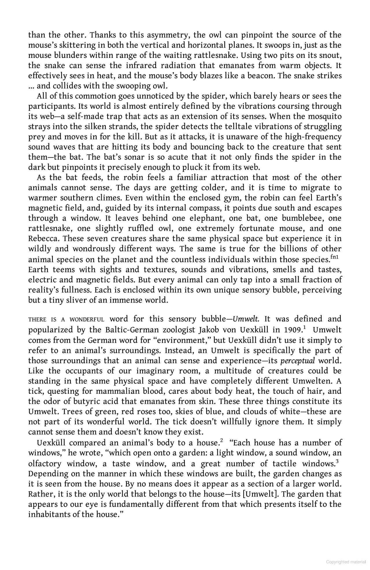 The Earth teems with sights and textures, sounds and vibrations, smells and tastes, electric and magnetic fields. But every animal is enclosed within its own unique sensory bubble, perceiving only a tiny sliver of an immense world. This book welcomes us into previously unfathomable dimensions - the world as it is truly perceived by other animals.
