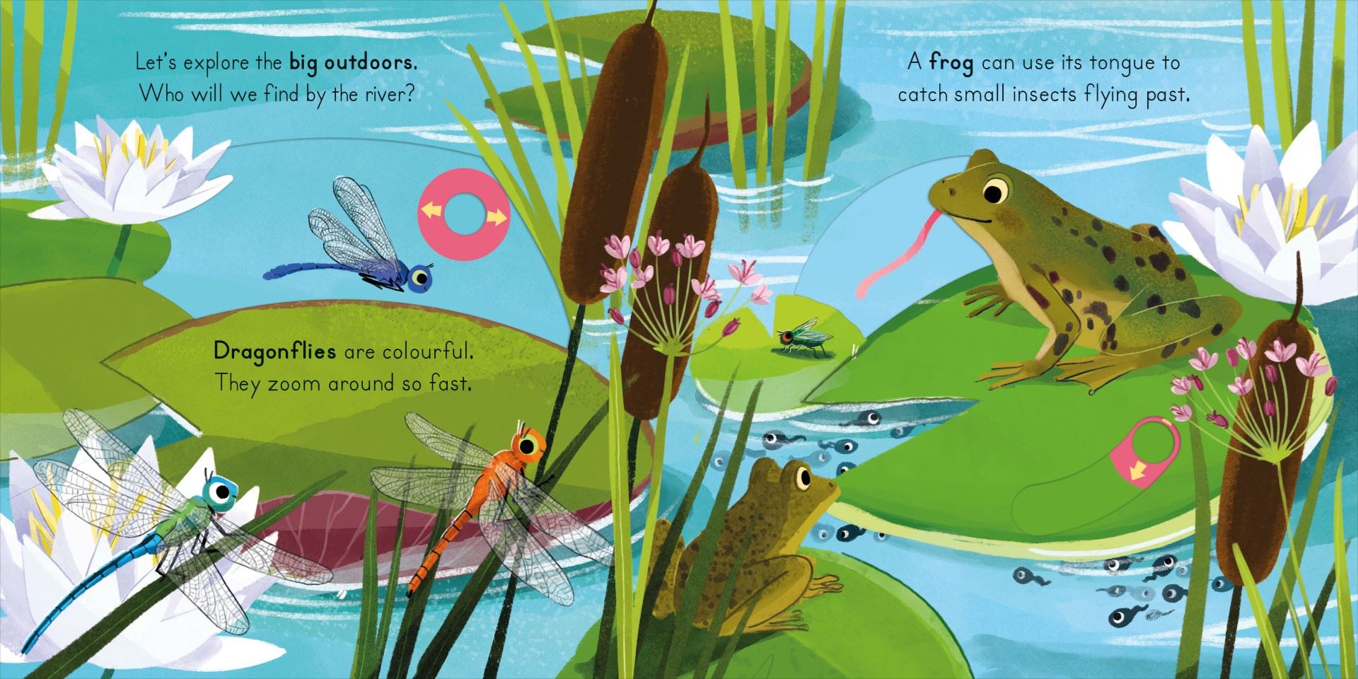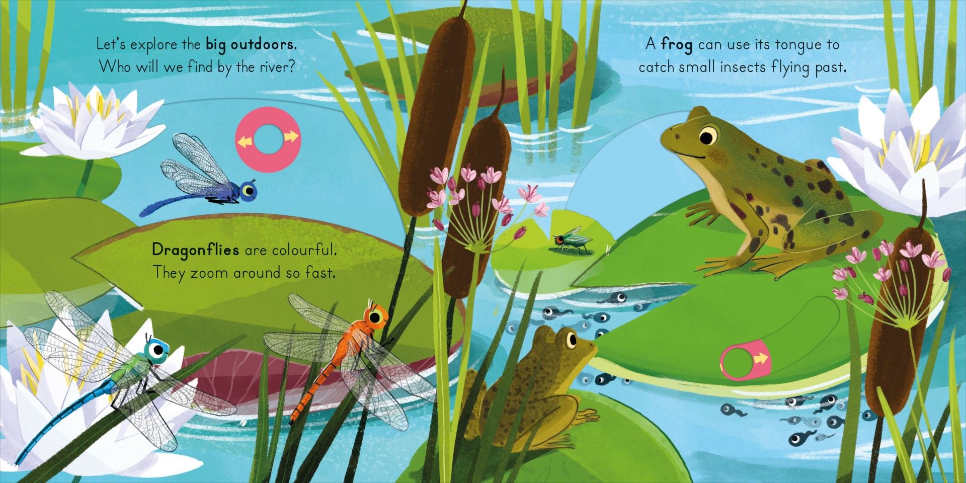 Explore the big outdoors in this board book with sliders on every page. There are ducks floating on the river, beavers building dams, frogs catching insects, and many more river creatures to bring to life with the robust, easy-to-use mechanisms, specially made for tiny hands. Published in collaboration with the National Trust, to inspire a love of nature in even the littlest animal lovers. Other titles in the series are Countryside, Seaside and Woods.