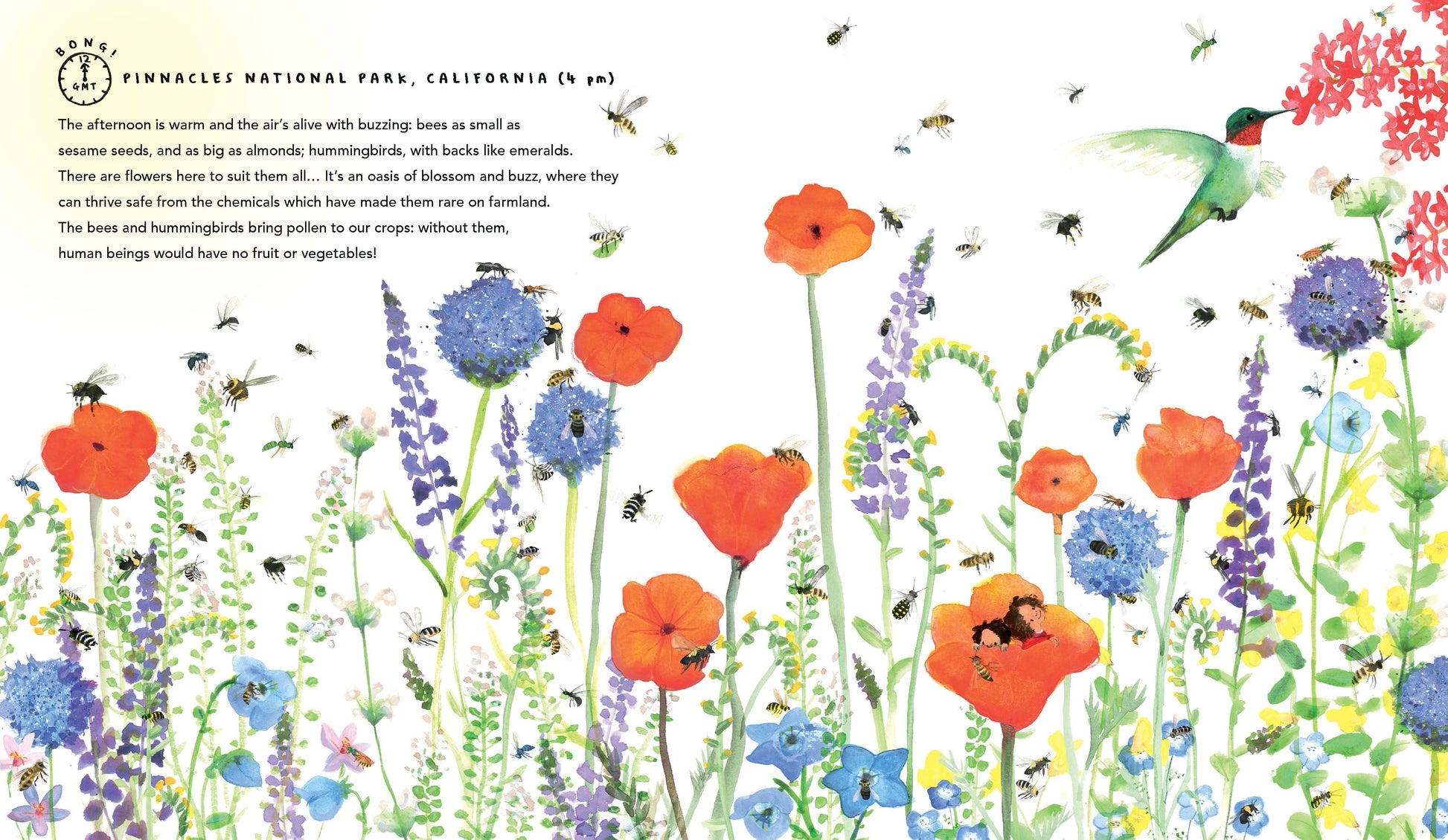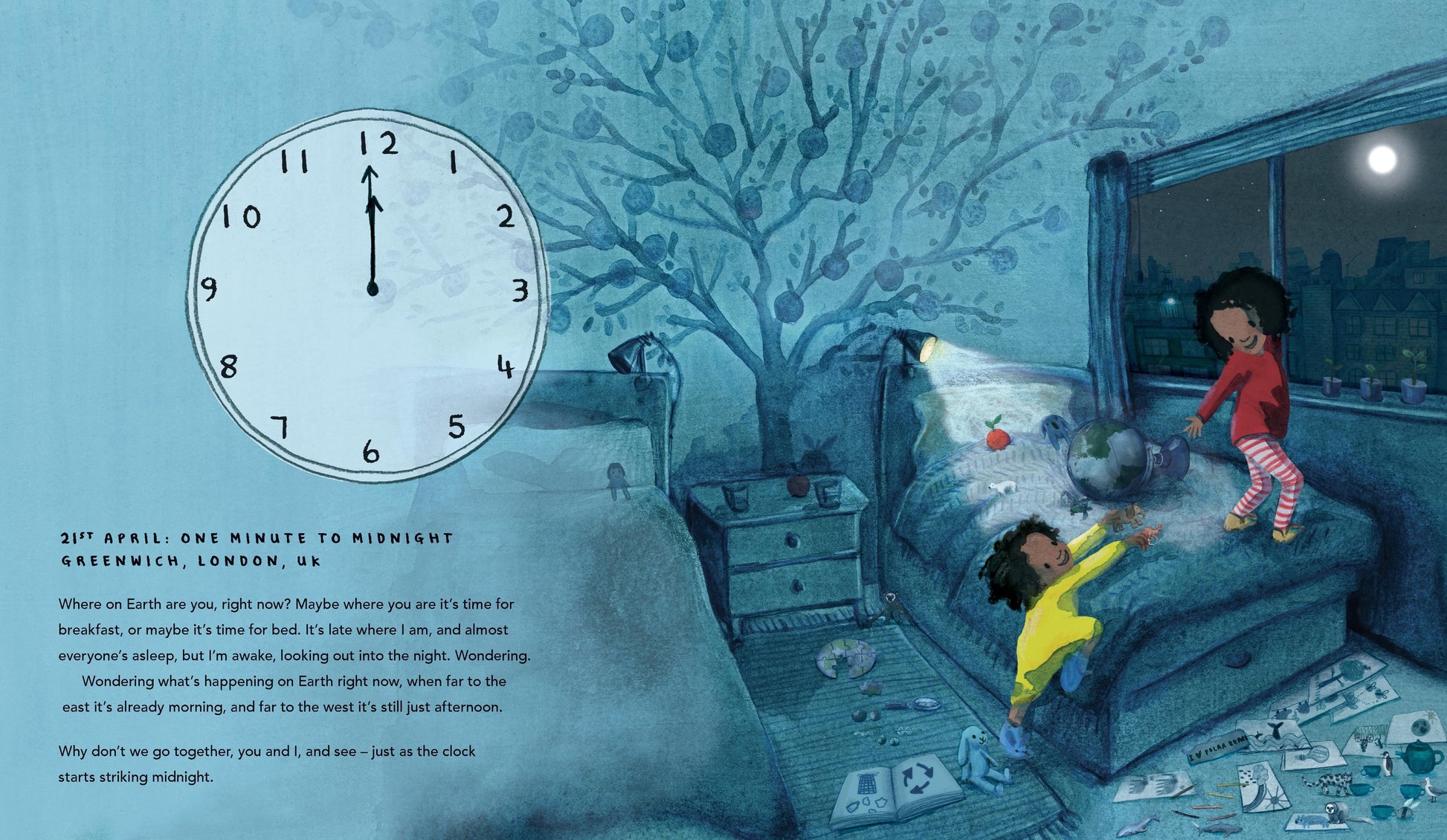 As the clock strikes midnight, a little girl and her sister visit animals of every shape and size, all around the world. They discover that, in some places, creatures have just started their day, while in others they’re already busy hunting for food. Turning the popular concept of time-zones on its head and combining it with a powerful climate message and delightful illustrations, this book is narrative non-fiction at its most spellbinding. First collaboration between Nicola Davies and Jenni Desmond.