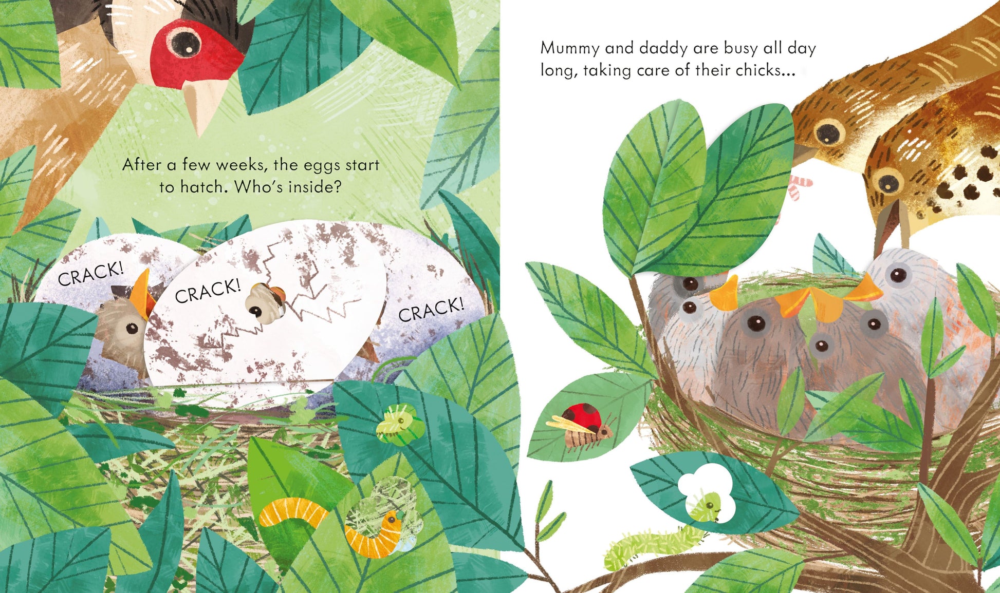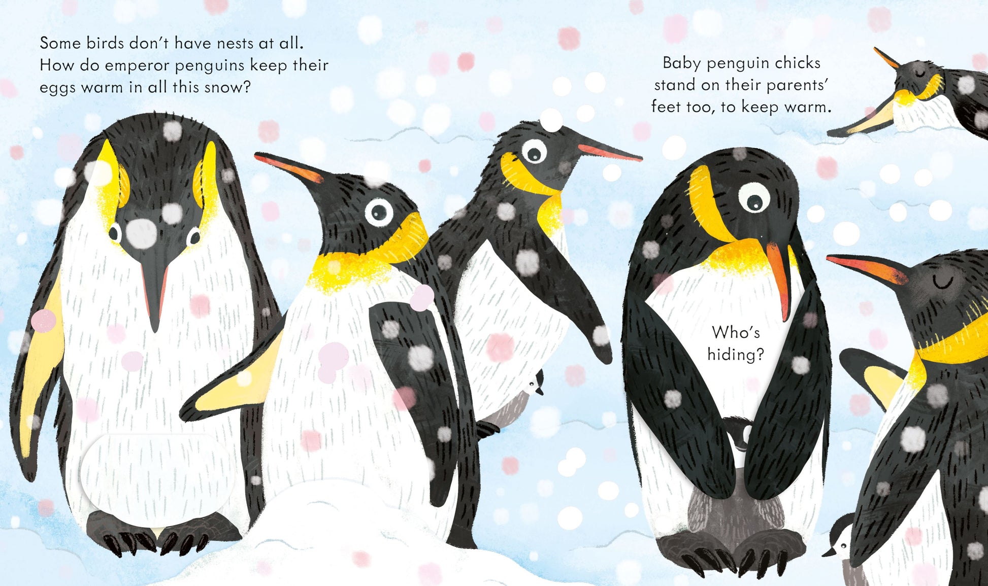Peep inside a bird's nest to see her precious eggs nestled there. Lift a flap to see them hatch, and find out how a bird takes care of its young. Discover all kinds of different nests and chicks, from teeny-tiny hummingbird nests to great big muddy flamingo nests, and learn how penguins take care of their eggs in the snow without a nest at all.