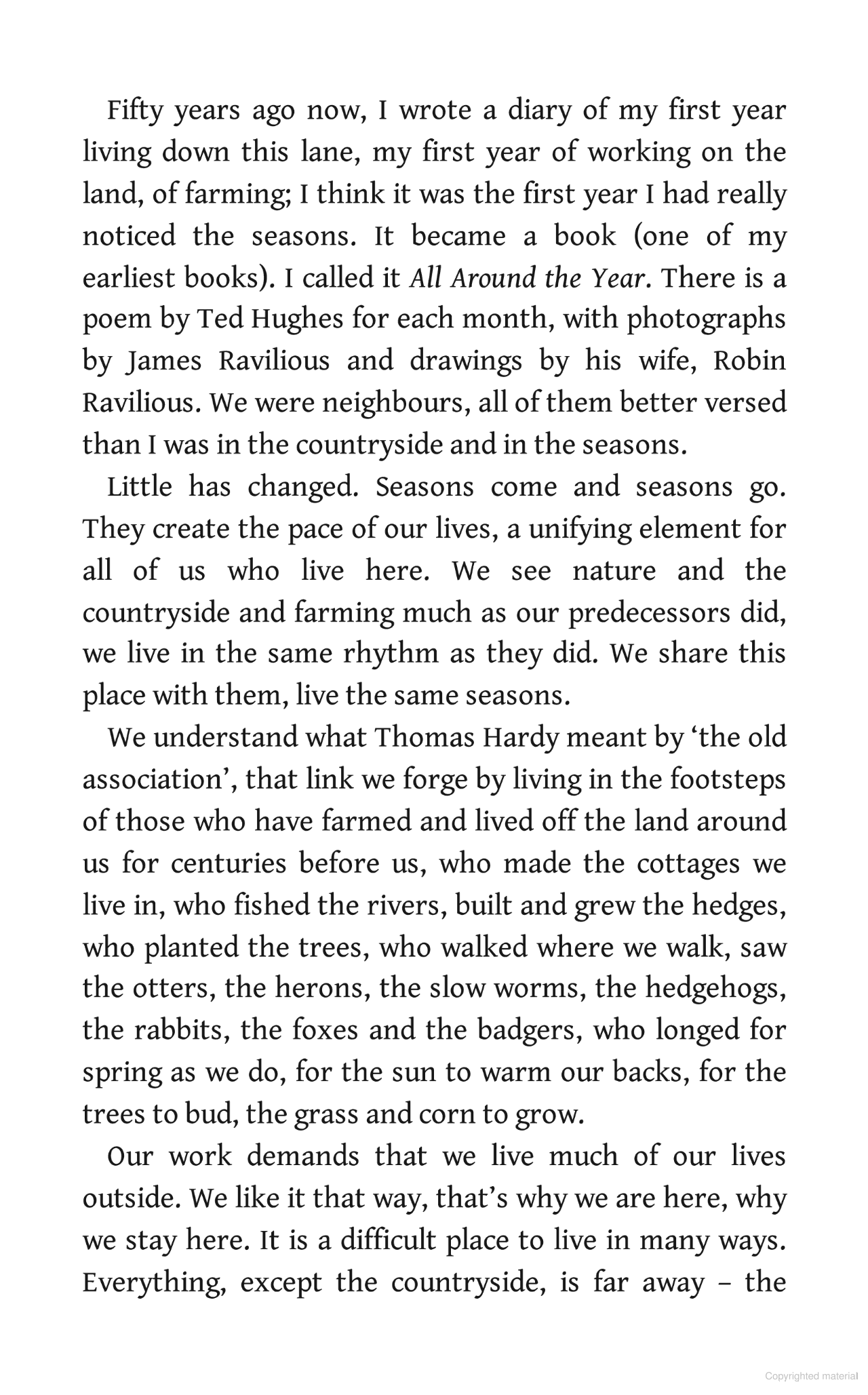 In this seasonal memoir, Michael Morpurgo reflects on daily life in the countryside through vivid snapshots of the animals that share his world. From watching lambs take their first shaky steps in the barn to catching glimpses of sharp-eyed sparrowhawks, hares darting across fields, and otters weaving secretly through rivers, his encounters are honest and alive with detail. Interwoven throughout are his original poems, offering a fresh, personal rhythm to the natural scenes he so masterfully describes.