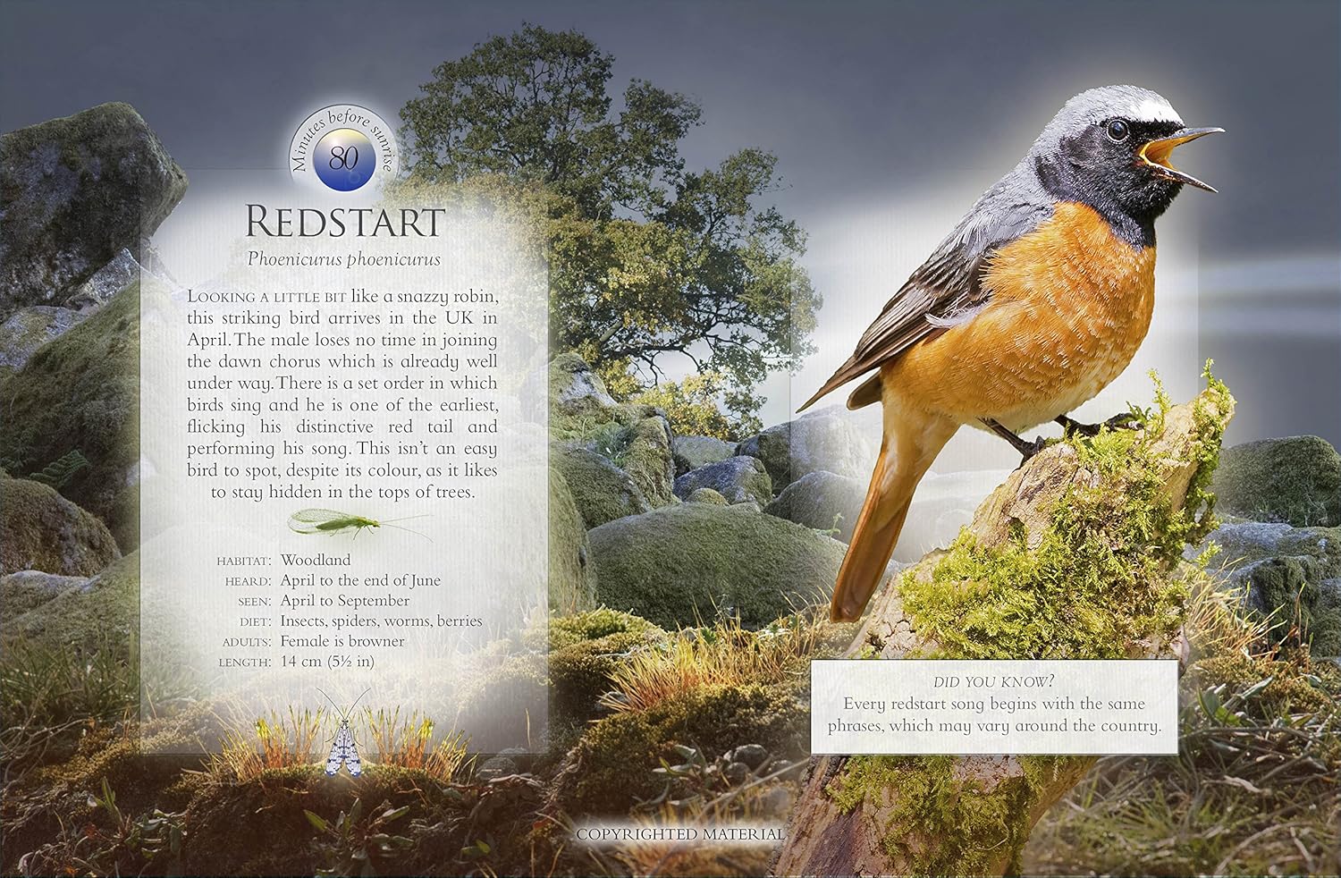 A magical journey through the hours before dawn, to find out which birds are singing and what they are communicating to each other. As the morning unfolds, not only can you find out what birds join in the dawn chorus but you can also listen to their wonderful songs. Features the skylark, common redstart, barn swallow, robin, blackbird, song thrush, yellowhammer, wren, chiffchaff, house sparrow, collared dove, and starling, with interesting facts, beautiful photographs and high-quality sounds.